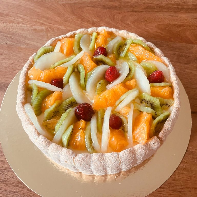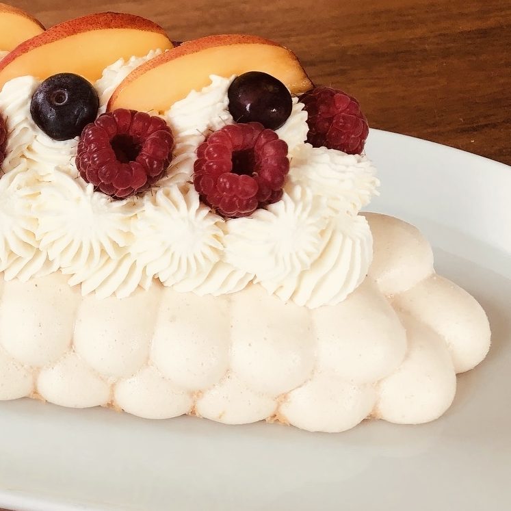 Meringue, chocolat blanc, curd framboise, chantilly mascarpone à la vanille, fruits de saison.