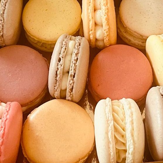 Coques de macarons fourrées avec une ganache montée à la vanille, et un coeur au choix :
